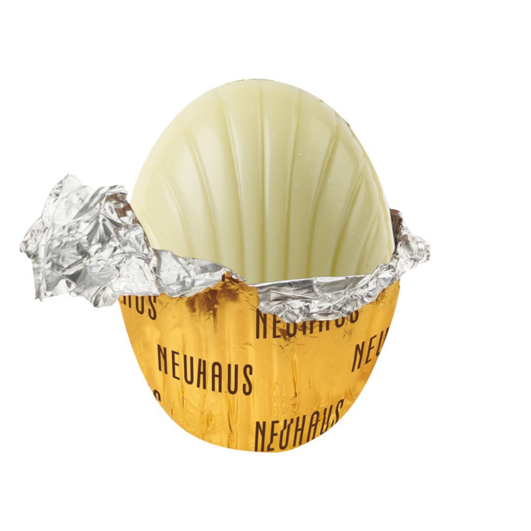 White chocolate easter egg with milk chocolate gianduja and puffed rice.
